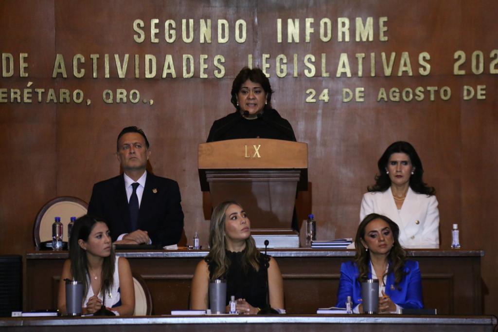 Contando con la presencia del gobernador Mauricio Kuri González y de la presidenta del Poder Judicial, Mariela Ponce Villa, así como como con la asistencia de exgobernadores, alcaldes, diputados federales, senadores, secretarios estatales; además de representantes de organismos autónomos y descentralizados, jueces y magistrados, trabajadores de la Legislatura y ciudadanía invitada, la legisladora expuso los resultados alcanzados en los cuatro ejes que enmarcan el trabajo desarrollado en este segundo año de actividades: Familia, educación y paridad transversal; Movilidad sustentable y desarrollo social; Gobernabilidad, participación ciudadana y uso de tecnologías; y Desarrollo económico, medio ambiente y calidad de vida.